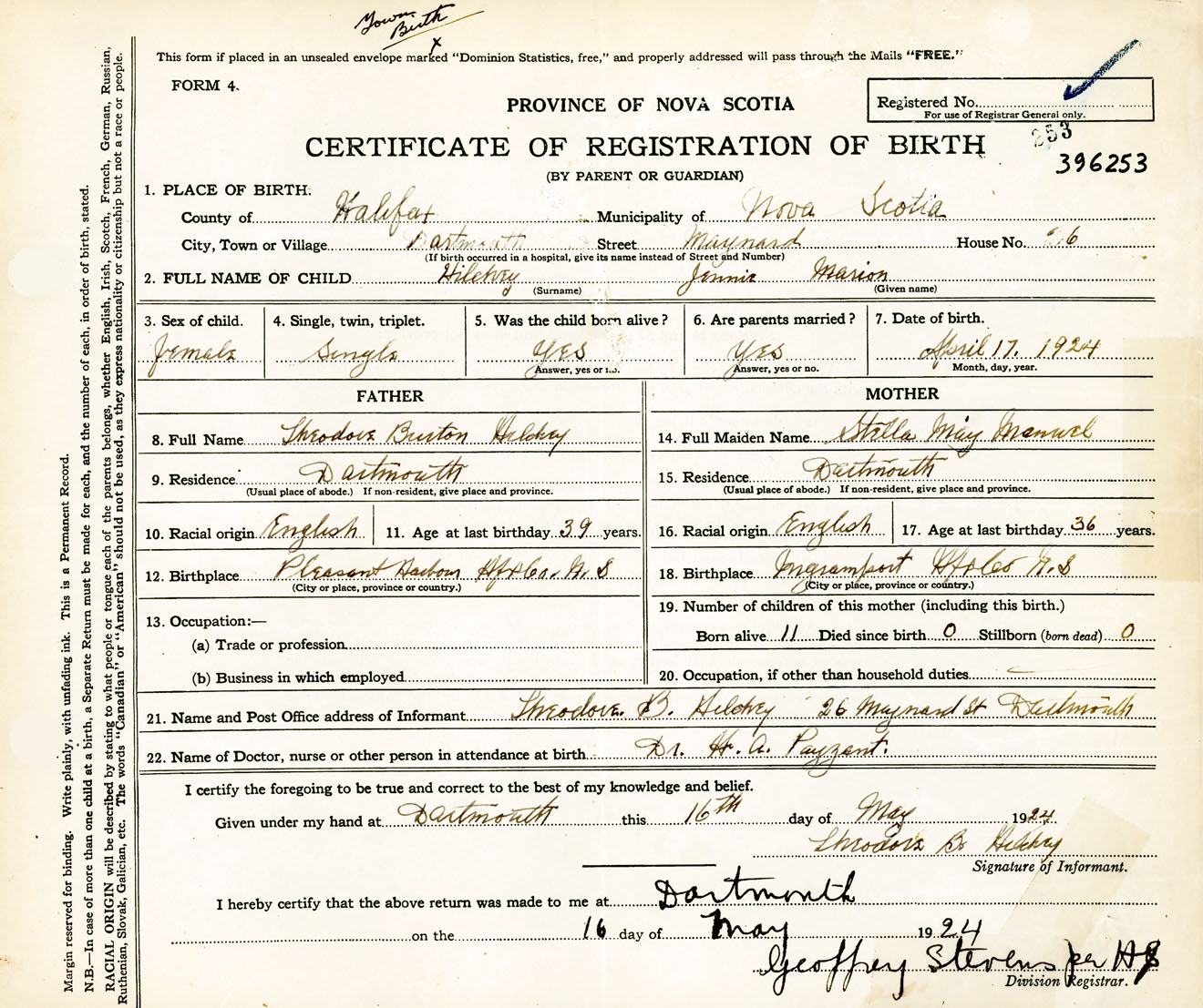 Female Birth Registration: Year: 1924 number: 39600253
