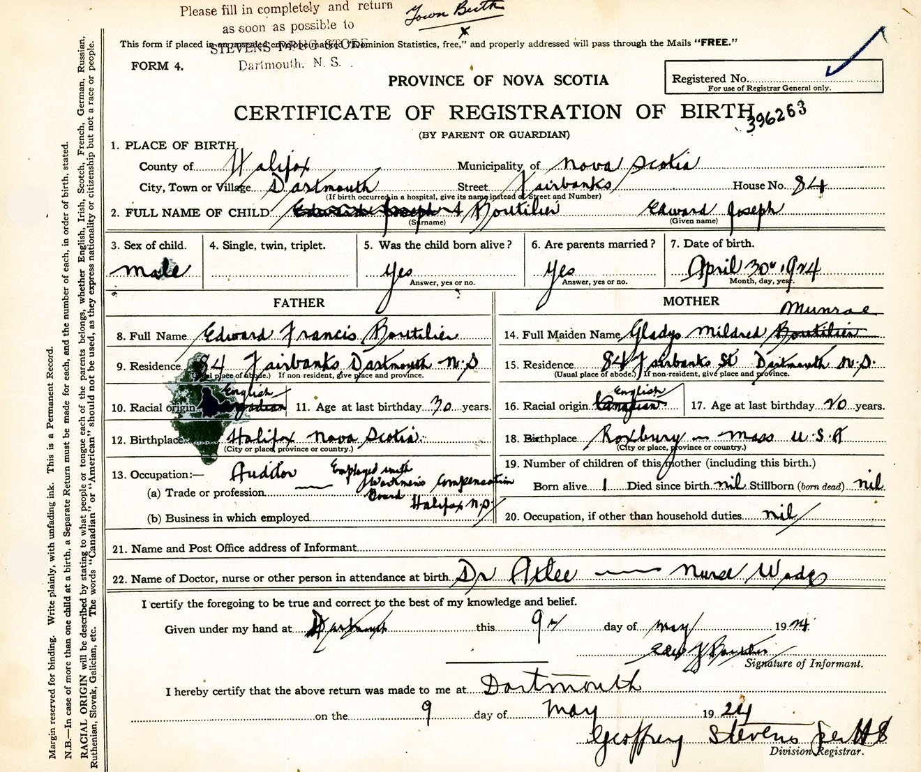 Male Birth Registration: Year: 1924 number: 39600263