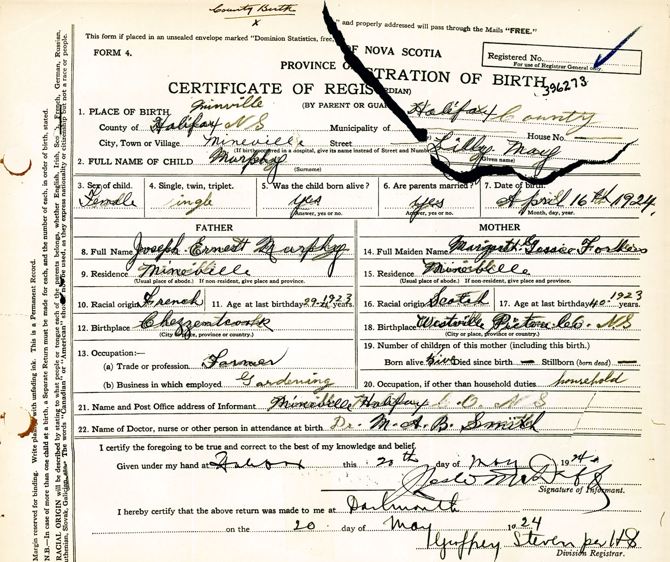Female Birth Registration: Year: 1924 number: 39600273