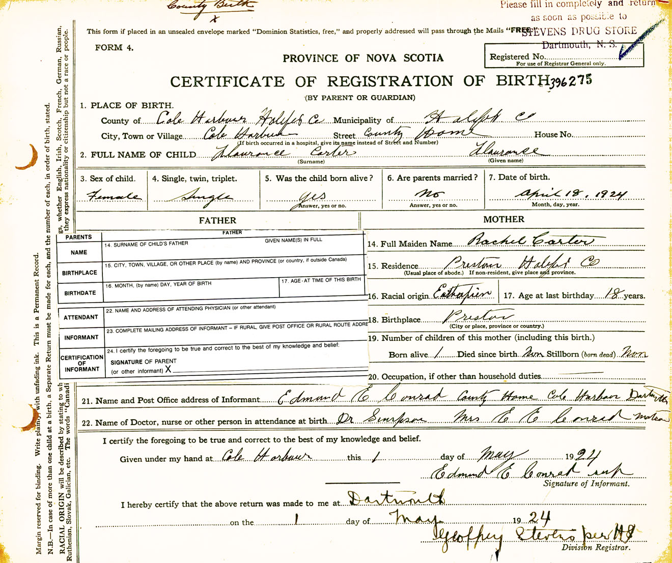 Female Birth Registration: Year: 1924 number: 39600275