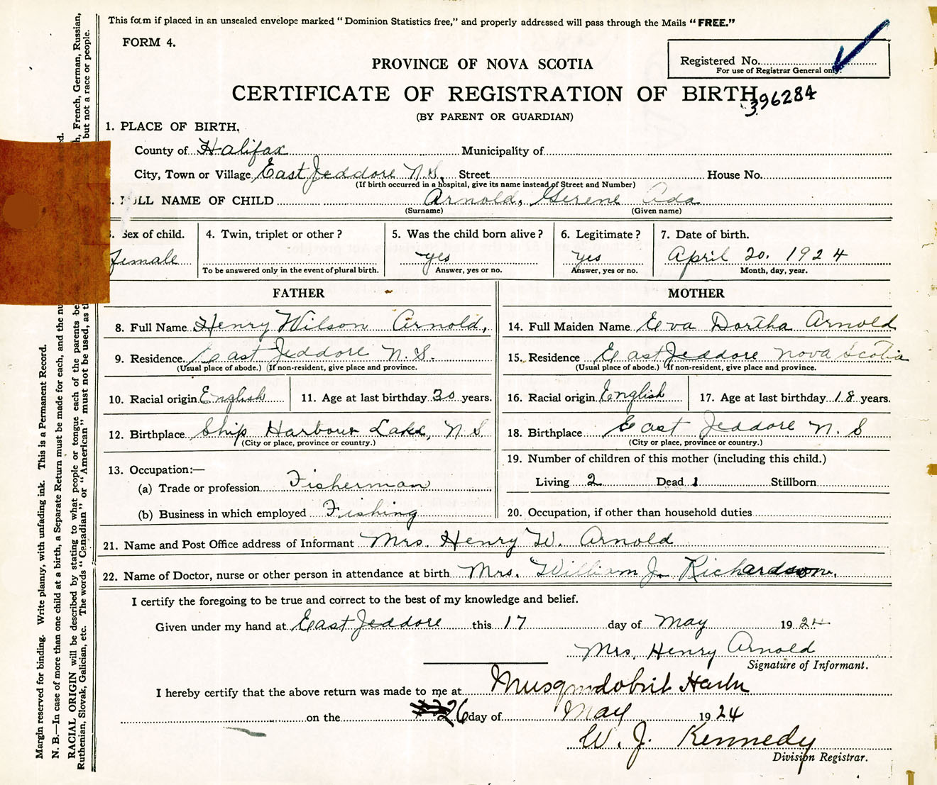 Female Birth Registration: Year: 1924 number: 39600284