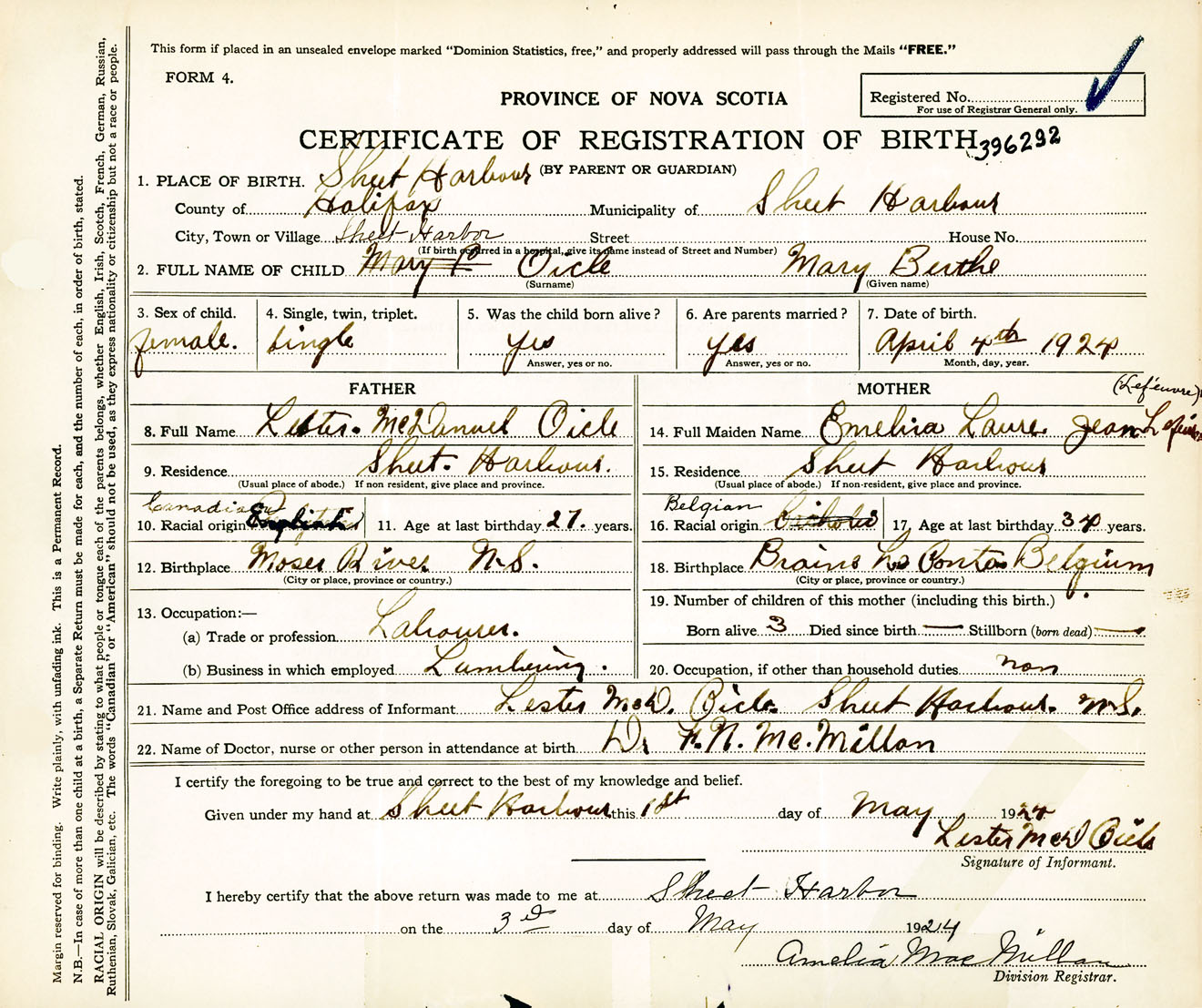 Female Birth Registration: Year: 1924 number: 39600292