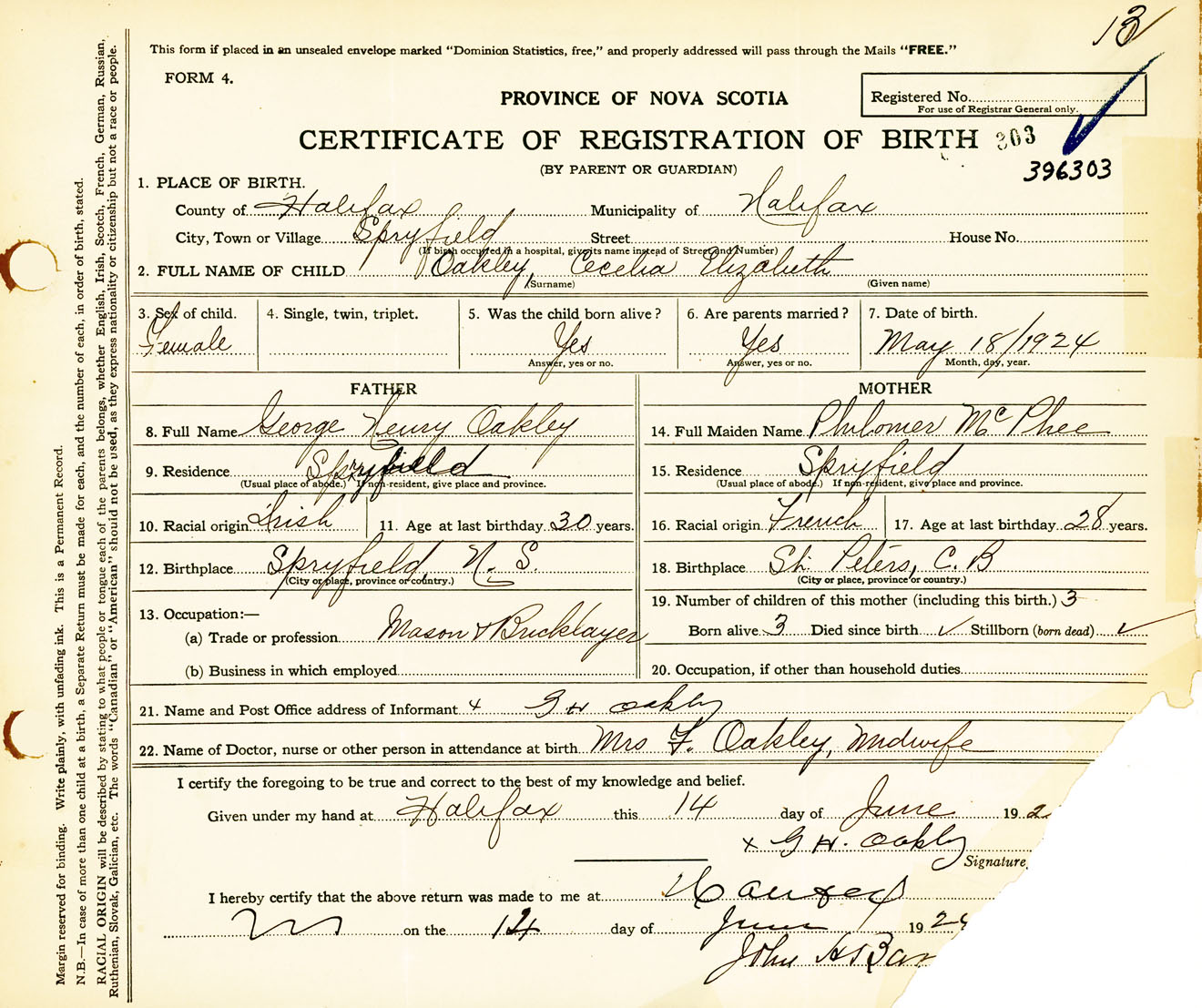 Female Birth Registration: Year: 1924 number: 39600303