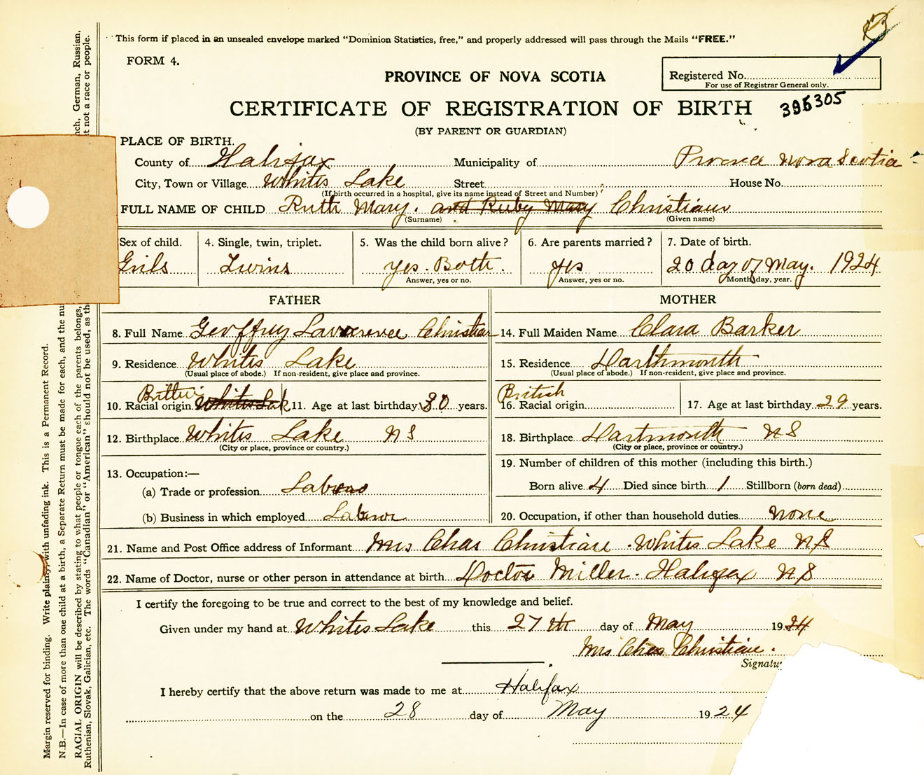 Female Birth Registration: Year: 1924 number: 39600305