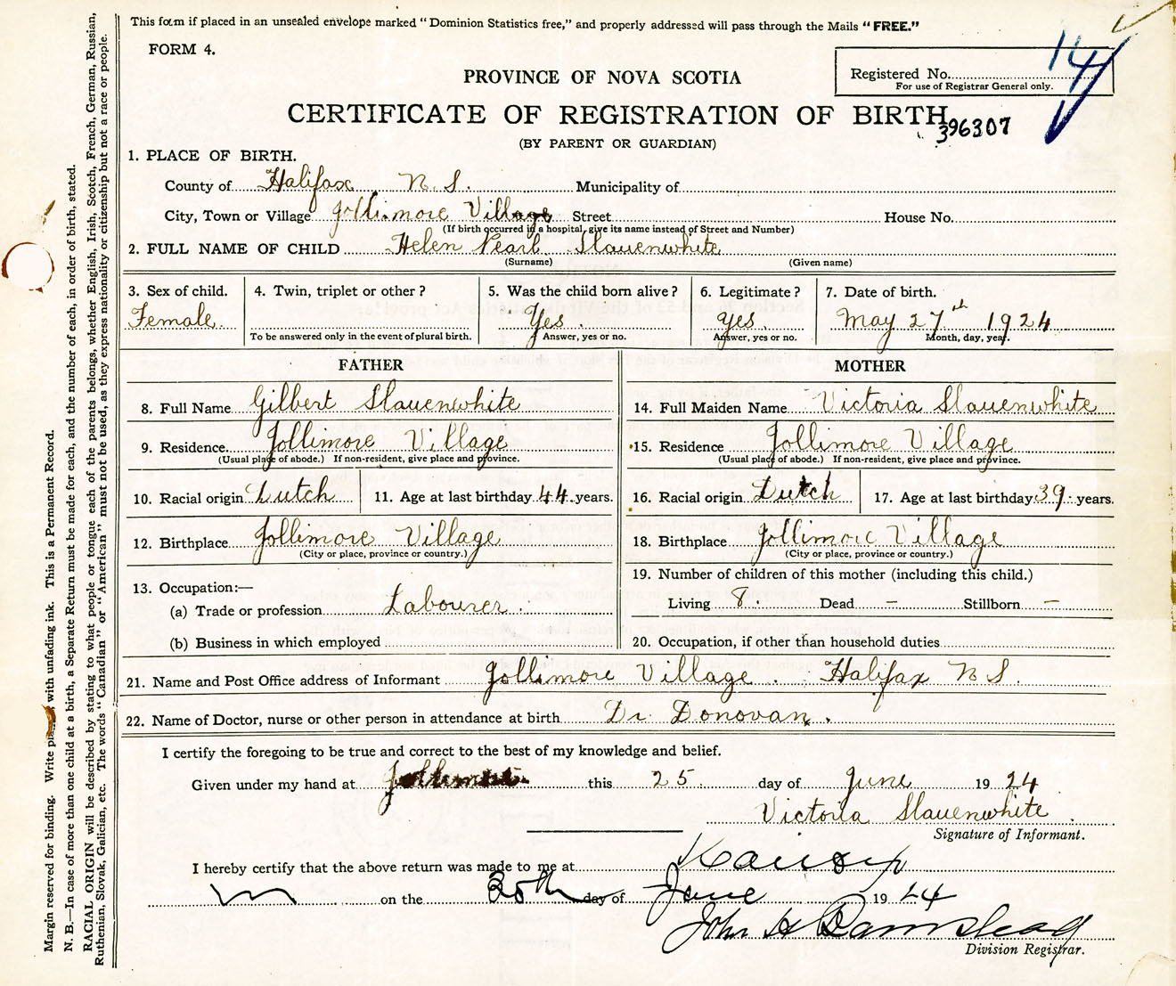Female Birth Registration: Year: 1924 number: 39600307