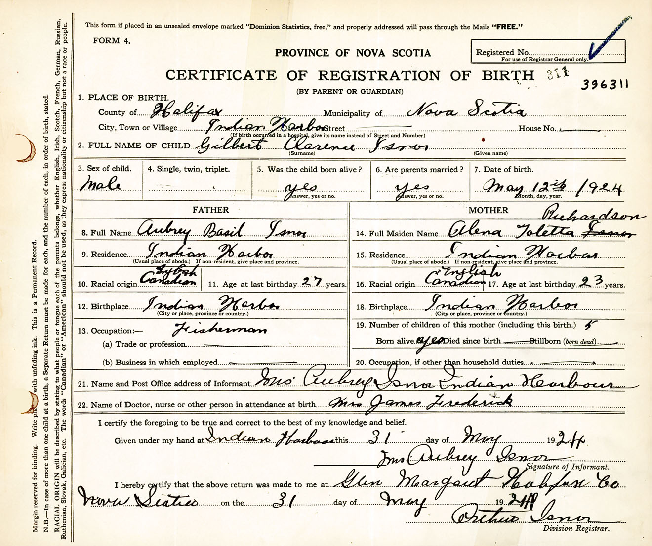Male Birth Registration: Year: 1924 number: 39600311
