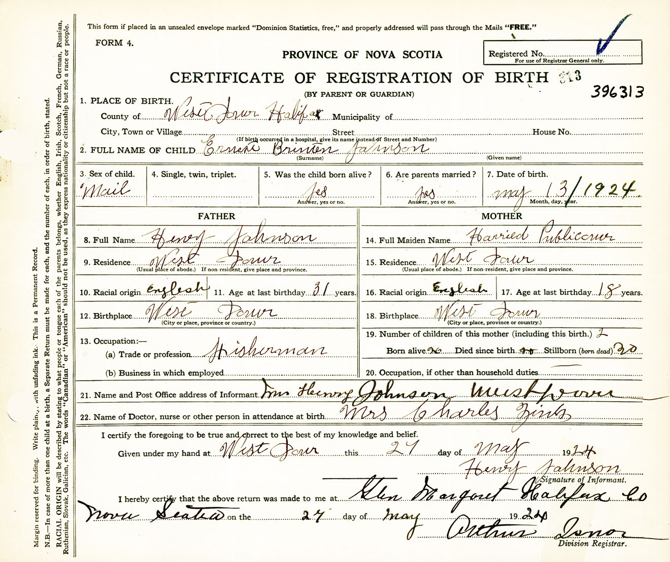 Male Birth Registration: Year: 1924 number: 39600313