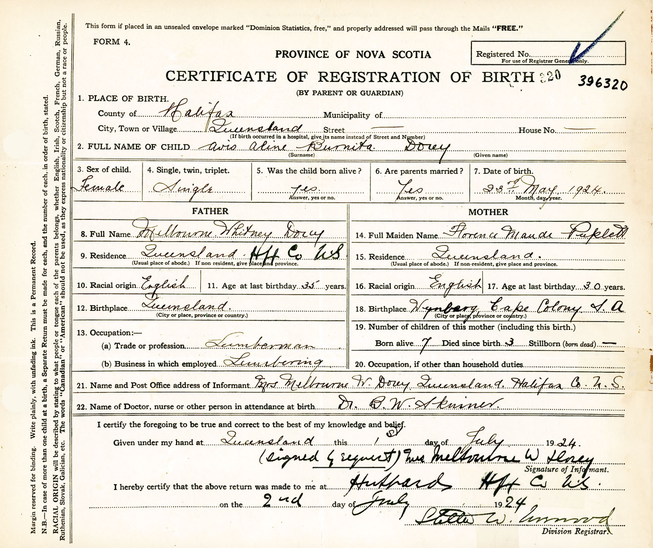 Female Birth Registration: Year: 1924 number: 39600320