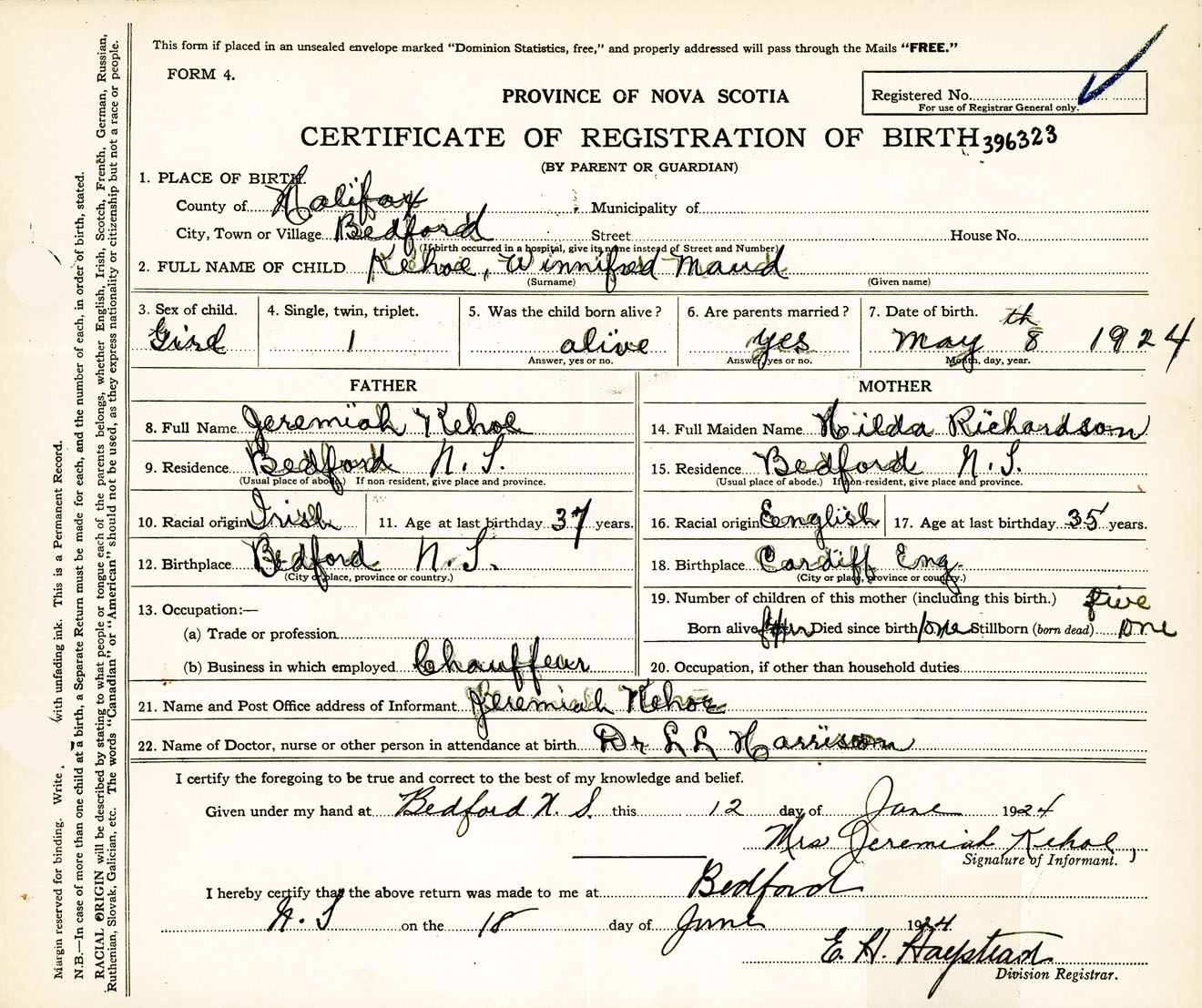 Female Birth Registration: Year: 1924 number: 39600323