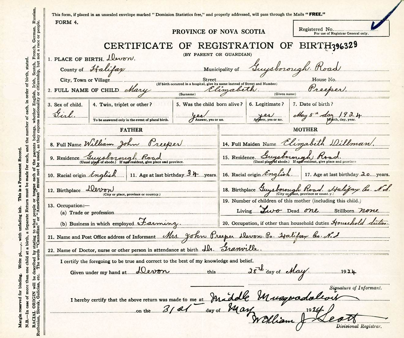 Female Birth Registration: Year: 1924 number: 39600329