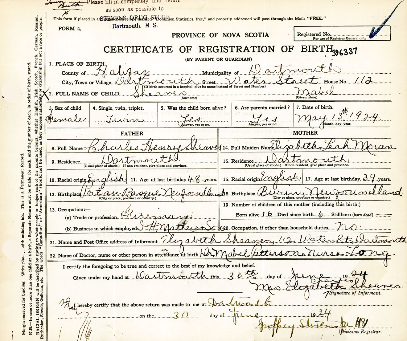 Female Birth Registration: Year: 1924 number: 39600337