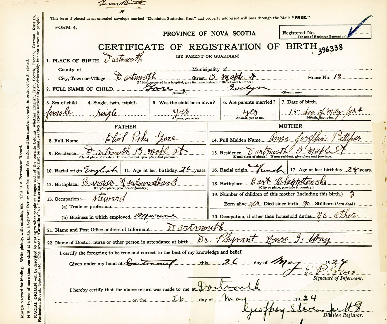 Female Birth Registration: Year: 1924 number: 39600338