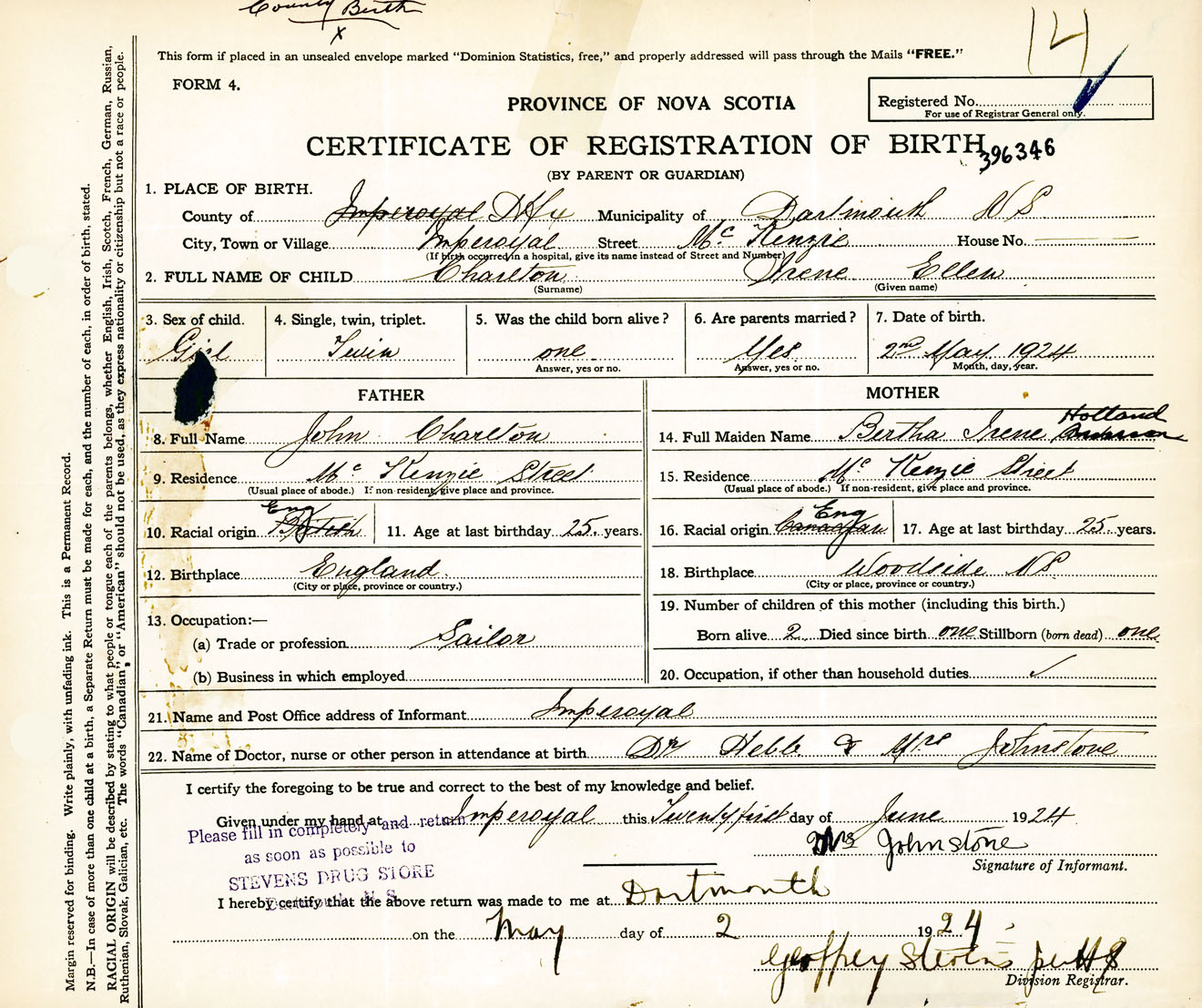 Female Birth Registration: Year: 1924 number: 39600346