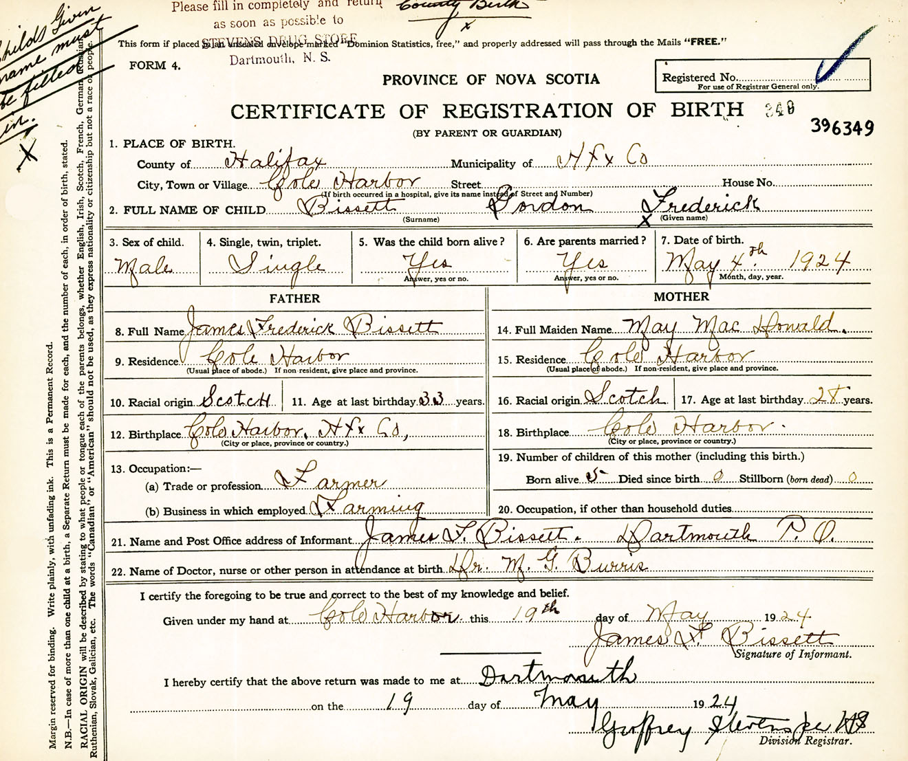 Male Birth Registration: Year: 1924 number: 39600349