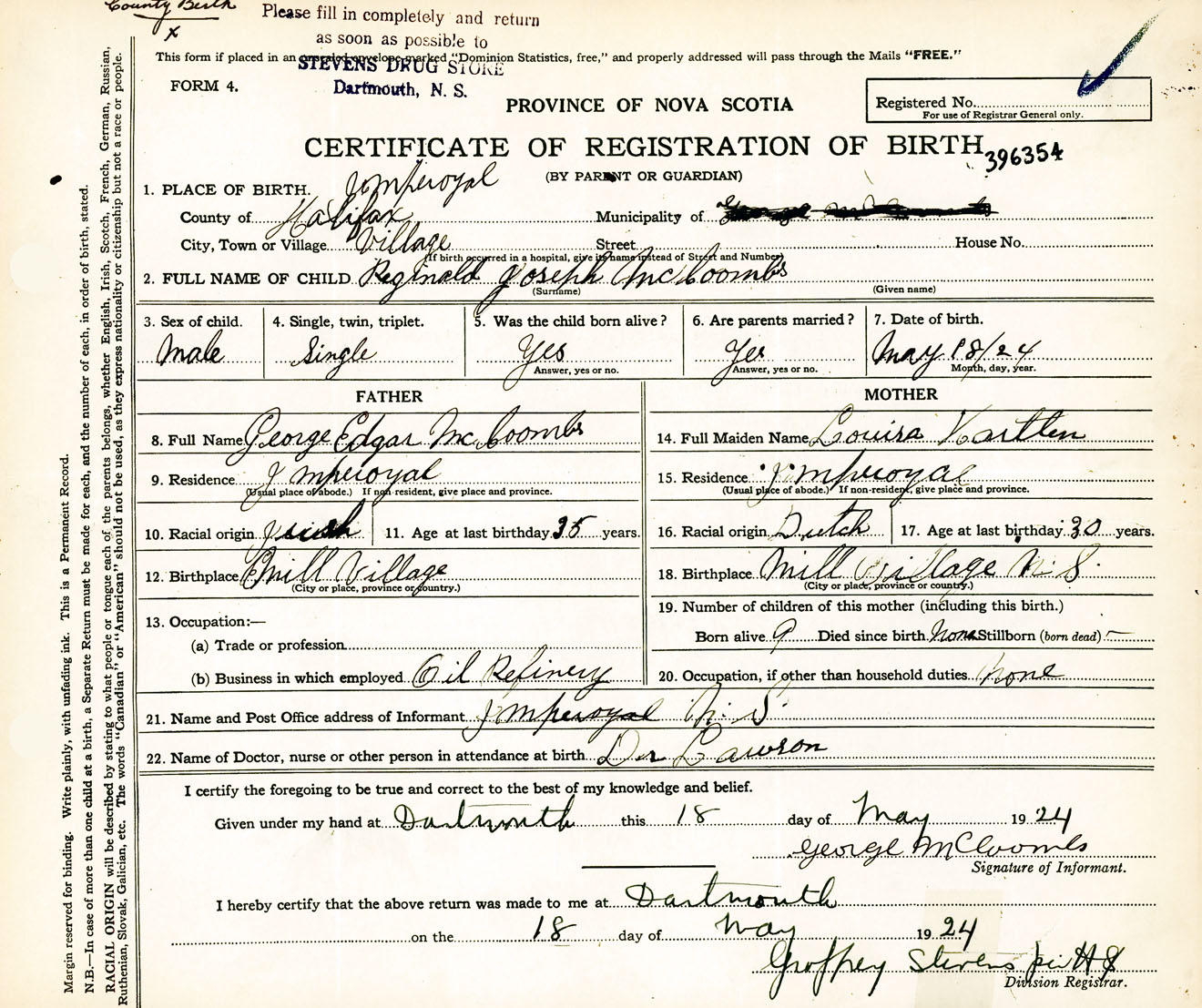Male Birth Registration: Year: 1924 number: 39600354