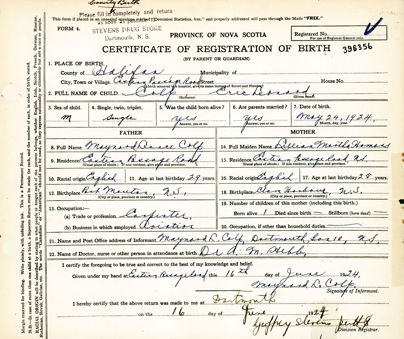 Male Birth Registration: Year: 1924 number: 39600356