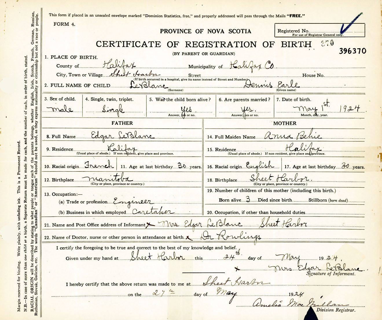 Male Birth Registration: Year: 1924 number: 39600370