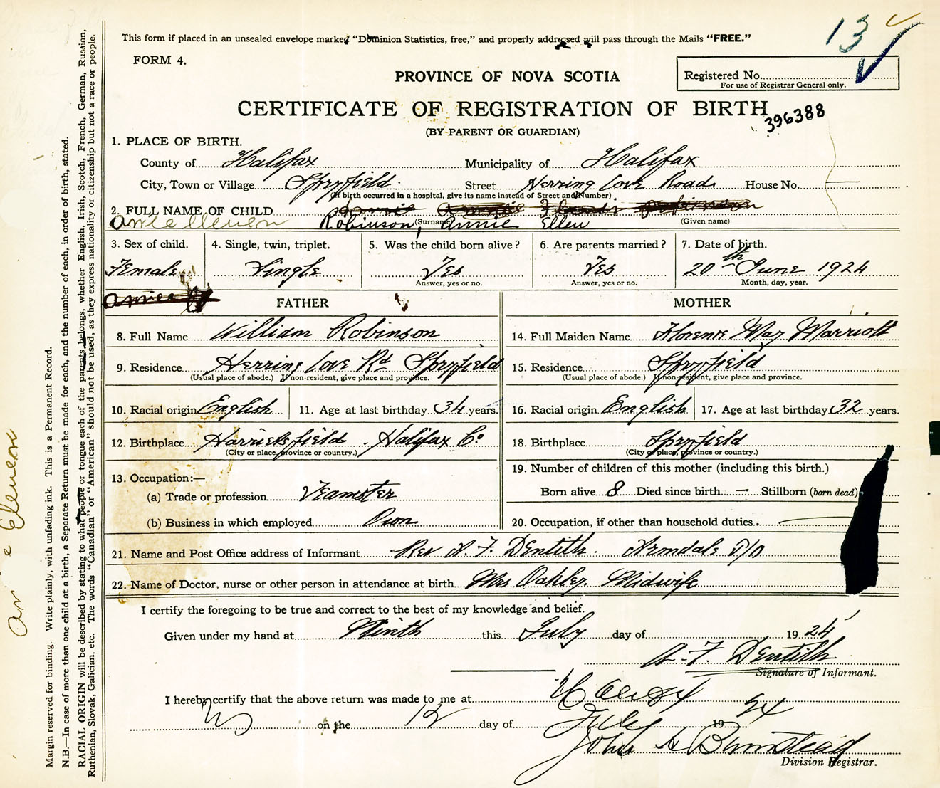 Female Birth Registration: Year: 1924 number: 39600388