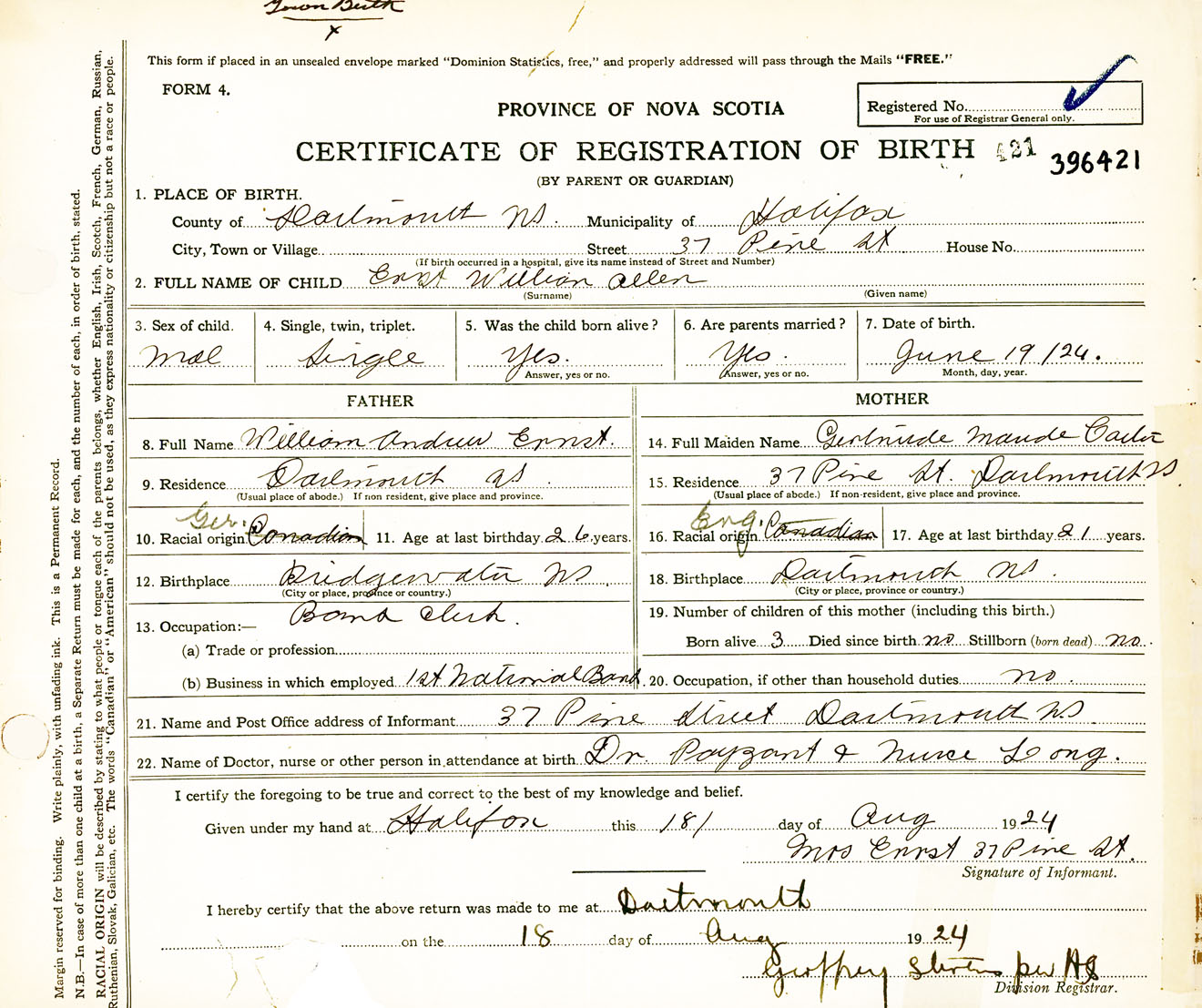 Male Birth Registration: Year: 1924 number: 39600421