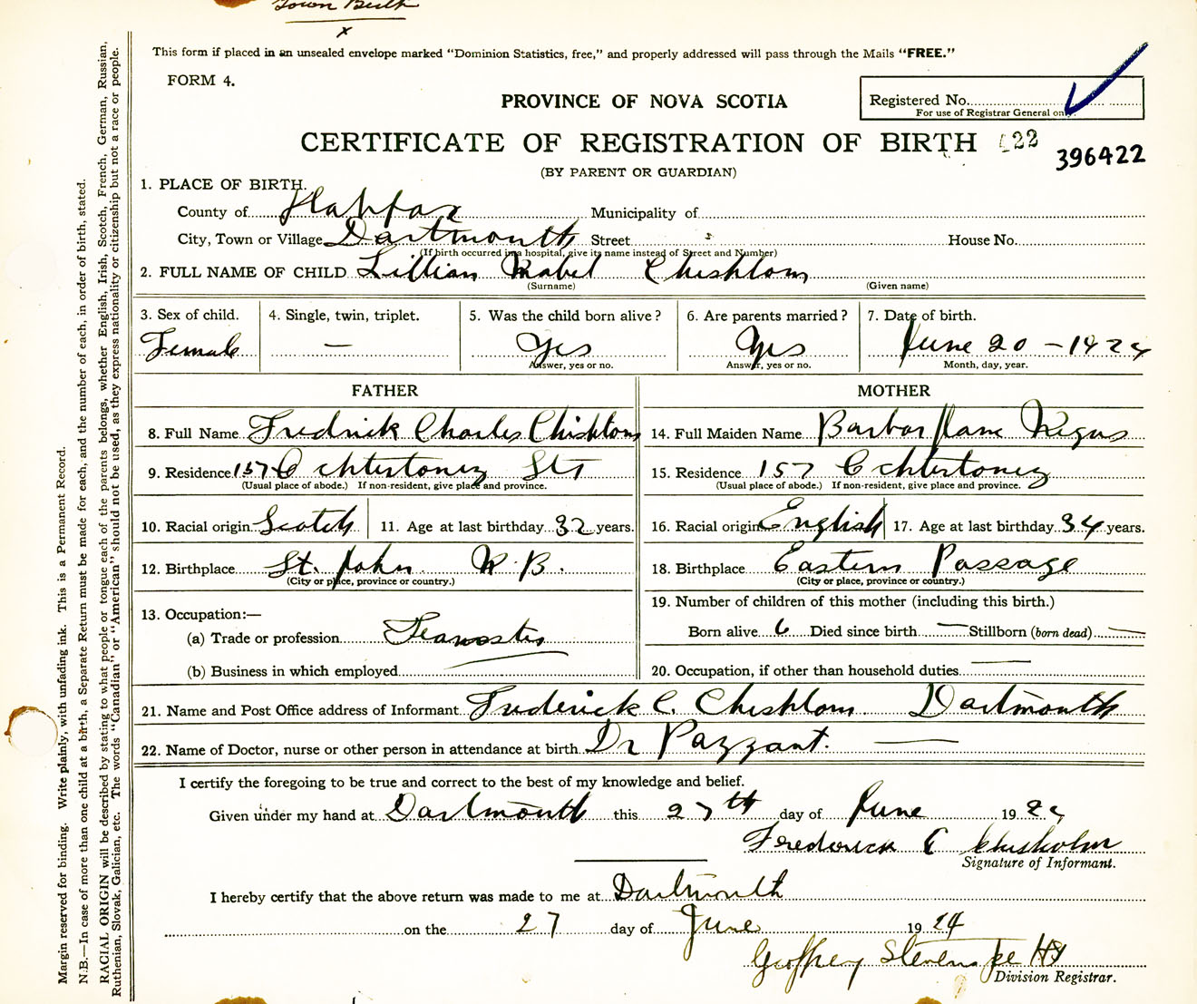 Female Birth Registration: Year: 1924 number: 39600422