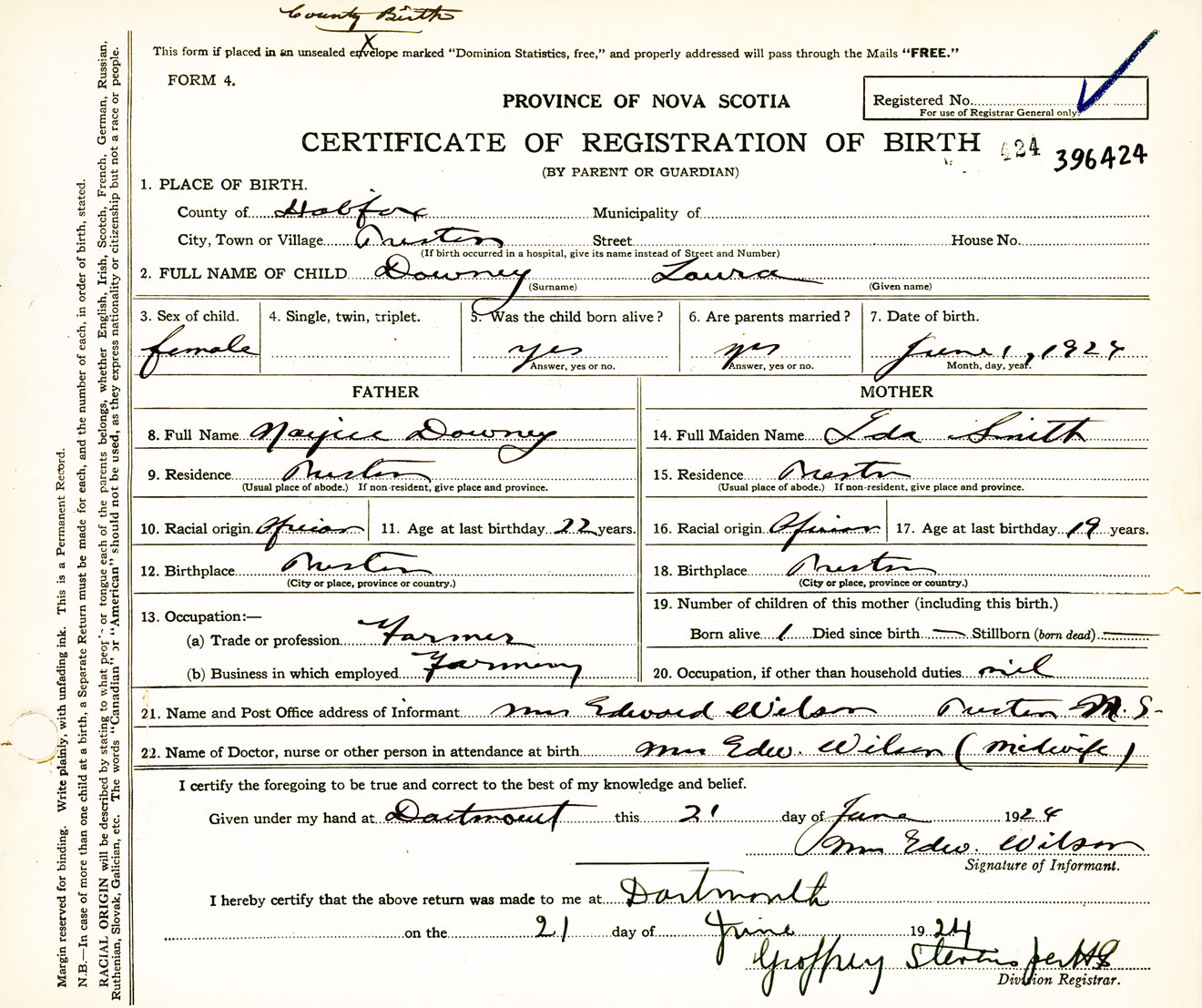 Female Birth Registration: Year: 1924 number: 39600424