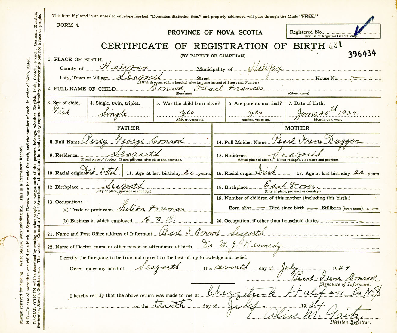 Female Birth Registration: Year: 1924 number: 39600434
