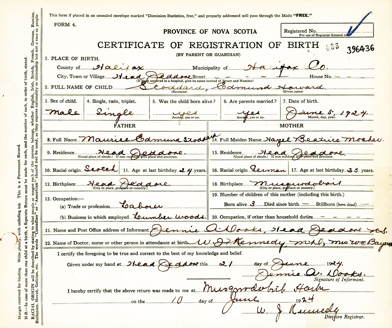 Male Birth Registration: Year: 1924 number: 39600436