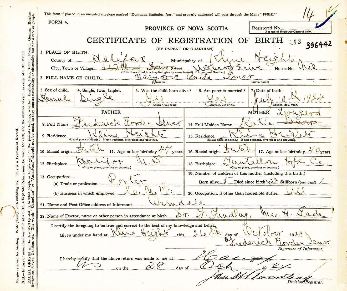 Female Birth Registration: Year: 1924 number: 39600442