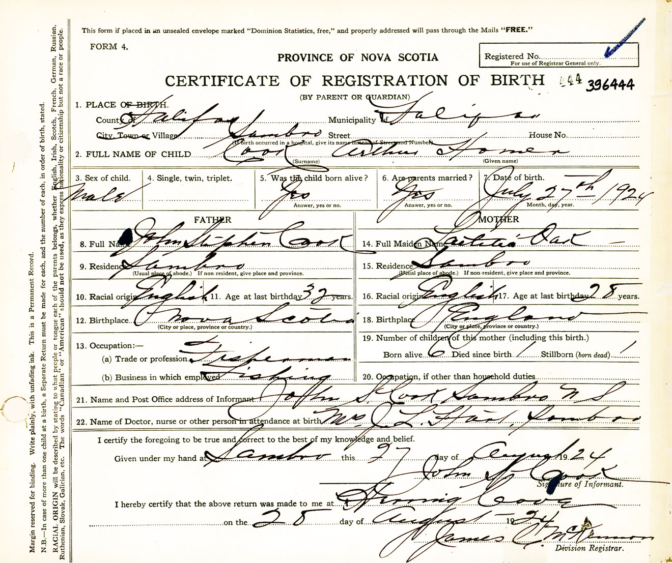 Male Birth Registration: Year: 1924 number: 39600444