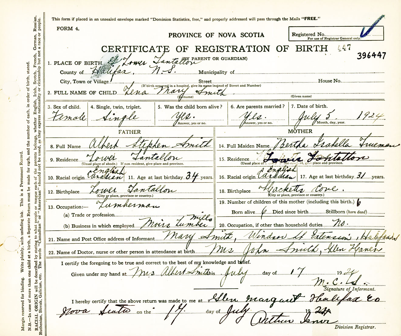 Female Birth Registration: Year: 1924 number: 39600447
