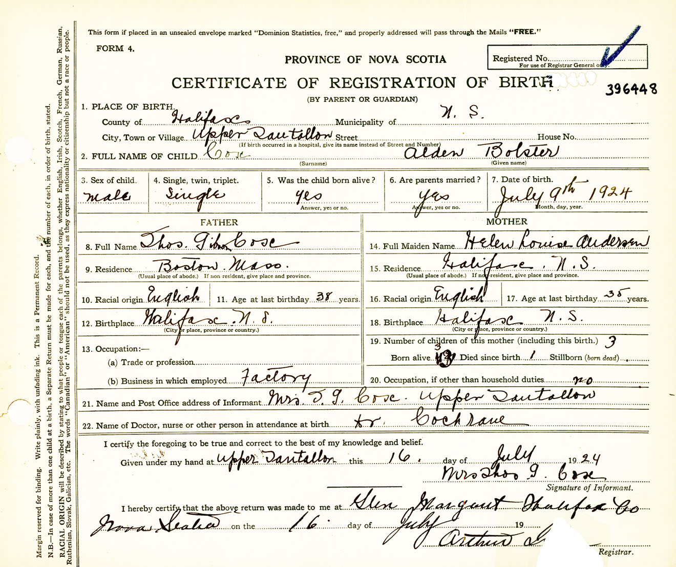 Male Birth Registration: Year: 1924 number: 39600448