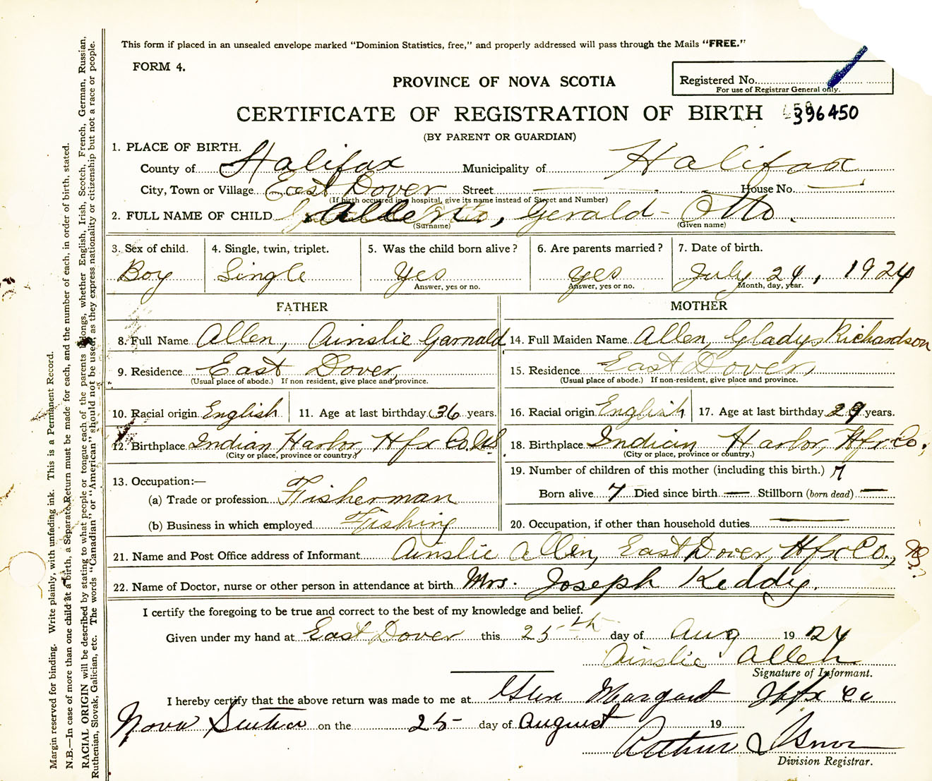Male Birth Registration: Year: 1924 number: 39600450