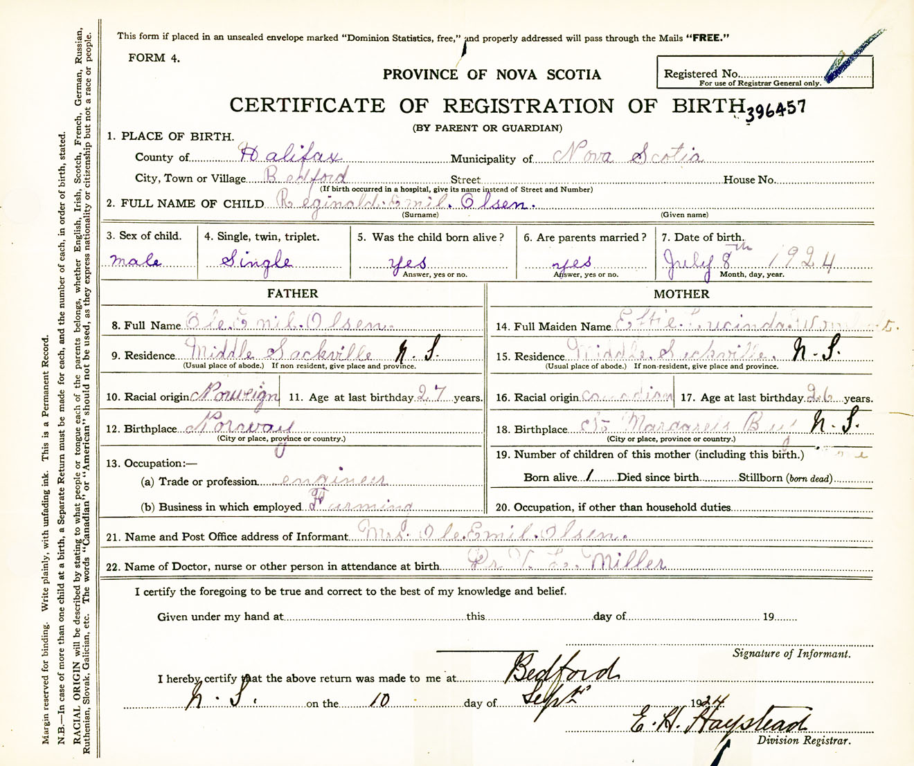 Male Birth Registration: Year: 1924 number: 39600457