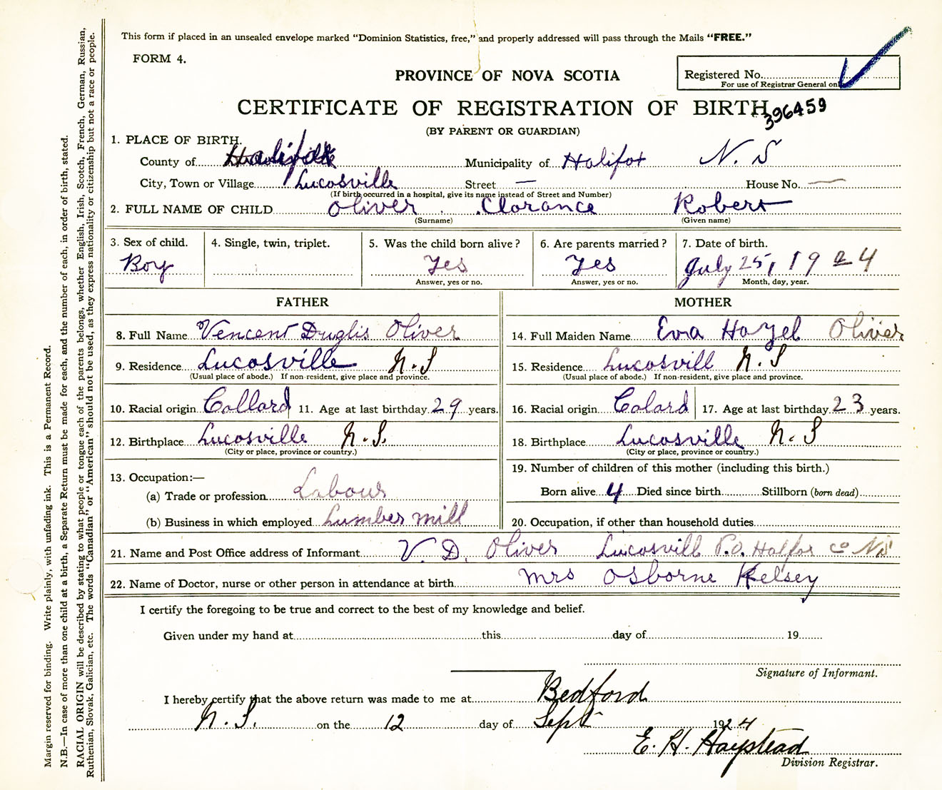 Male Birth Registration: Year: 1924 number: 39600459