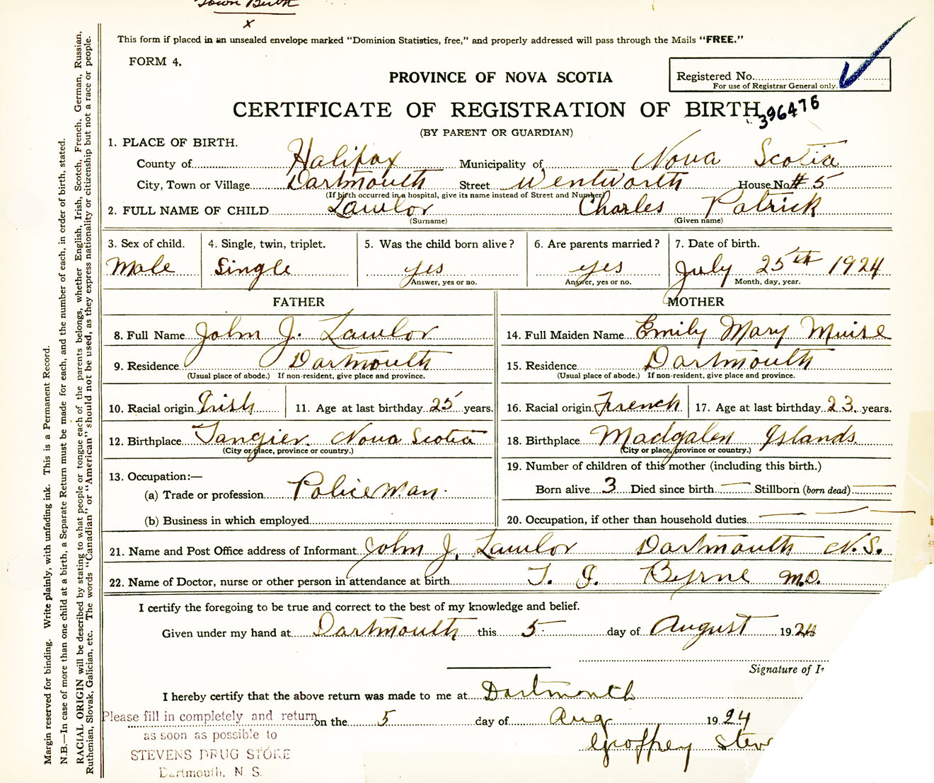 Male Birth Registration: Year: 1924 number: 39600476