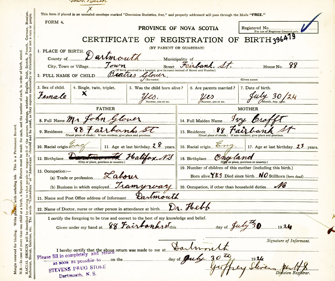 Female Birth Registration: Year: 1924 number: 39600479