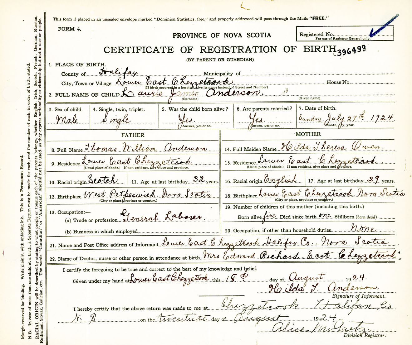 Male Birth Registration: Year: 1924 number: 39600499
