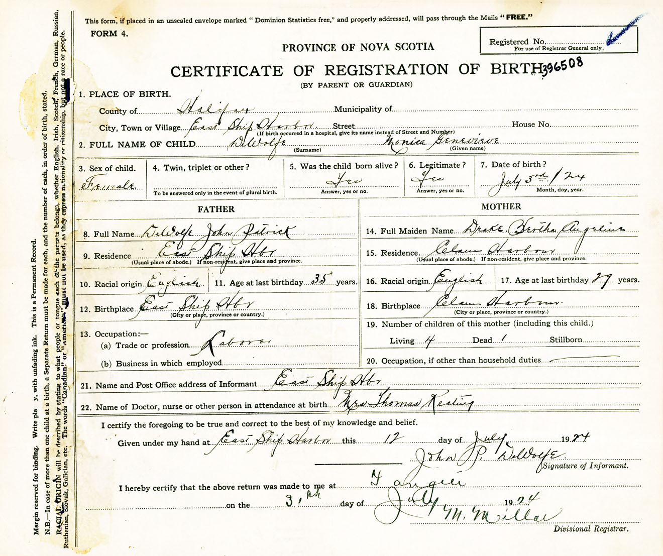 Female Birth Registration: Year: 1924 number: 39600508