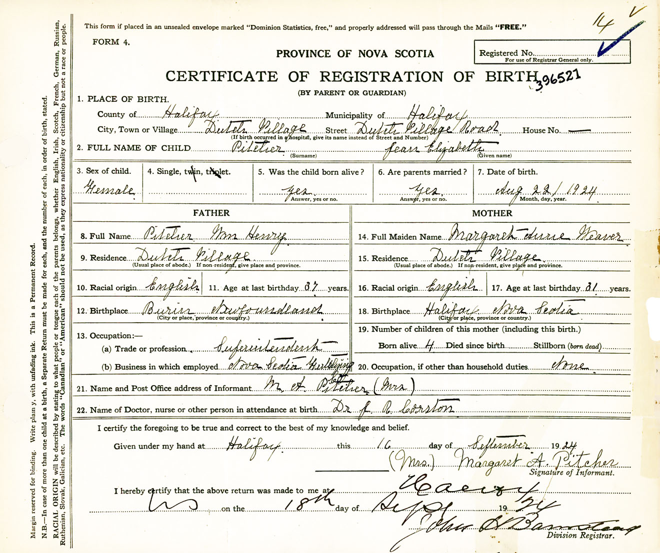 Female Birth Registration: Year: 1924 number: 39600521