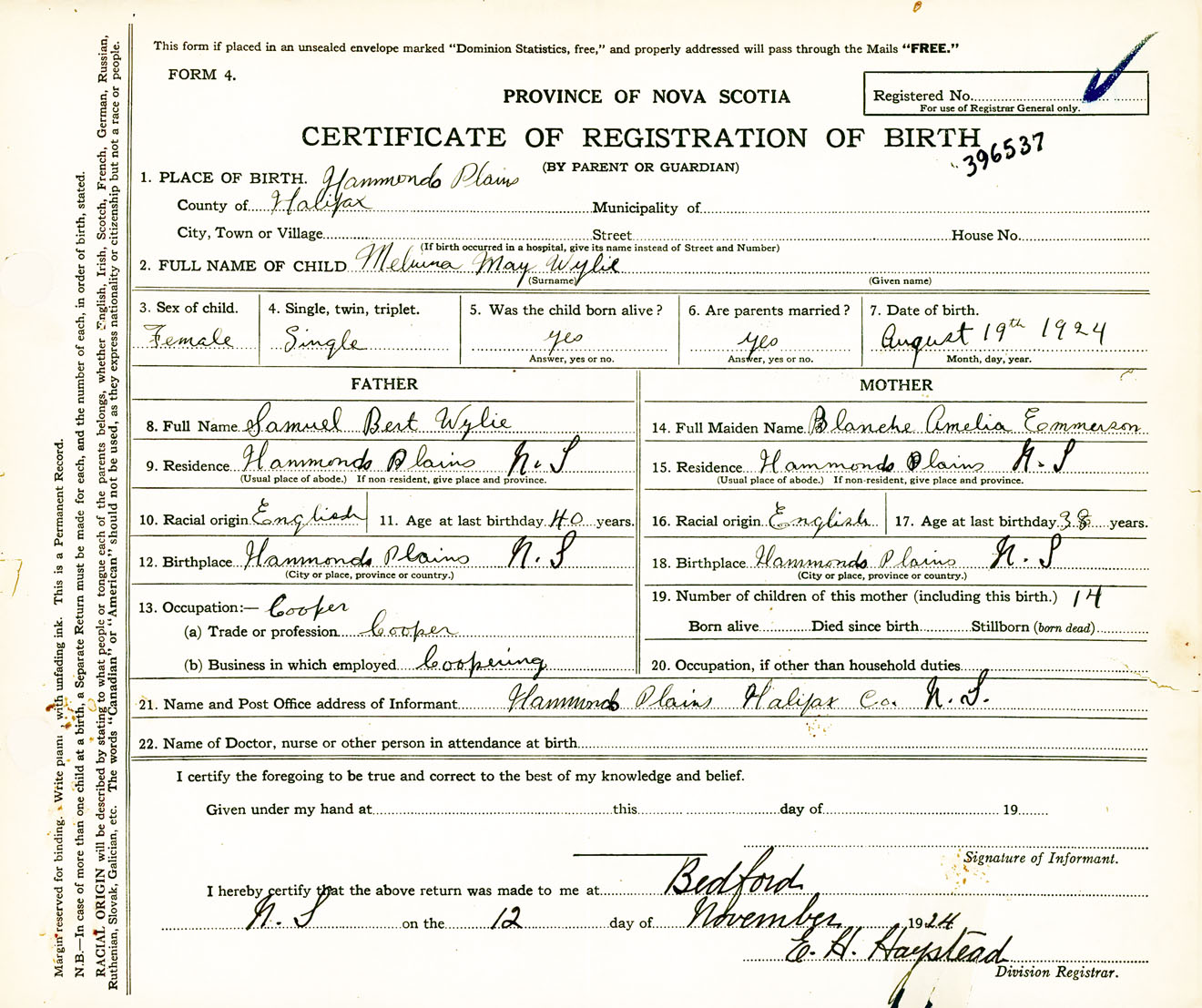 Female Birth Registration: Year: 1924 number: 39600537