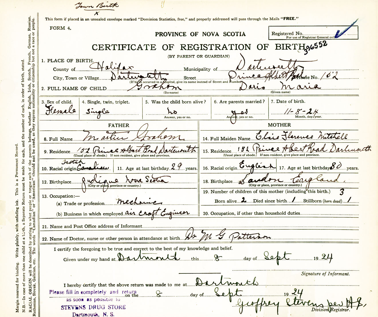 Female Birth Registration: Year: 1924 number: 39600552