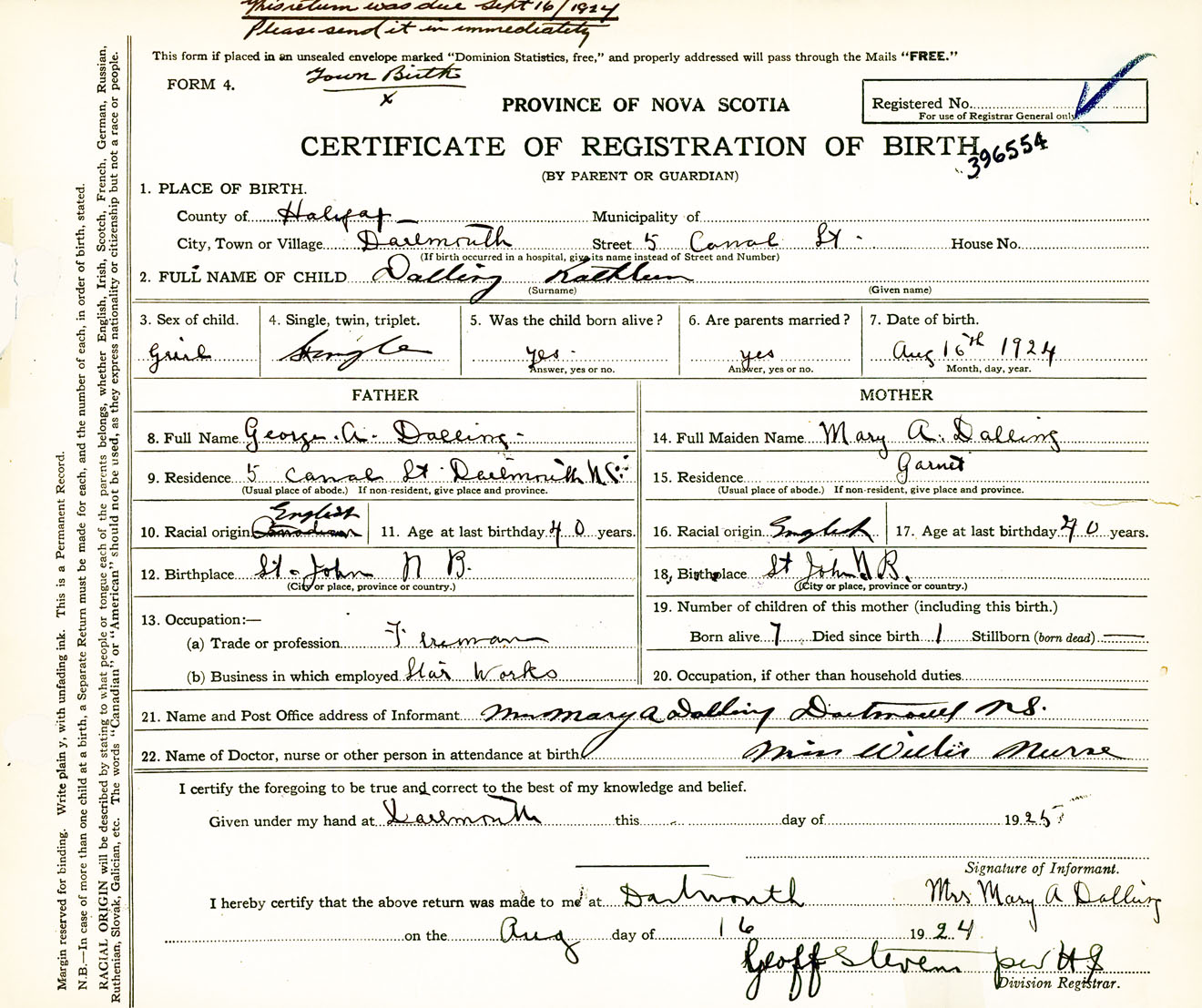 Female Birth Registration: Year: 1924 number: 39600554