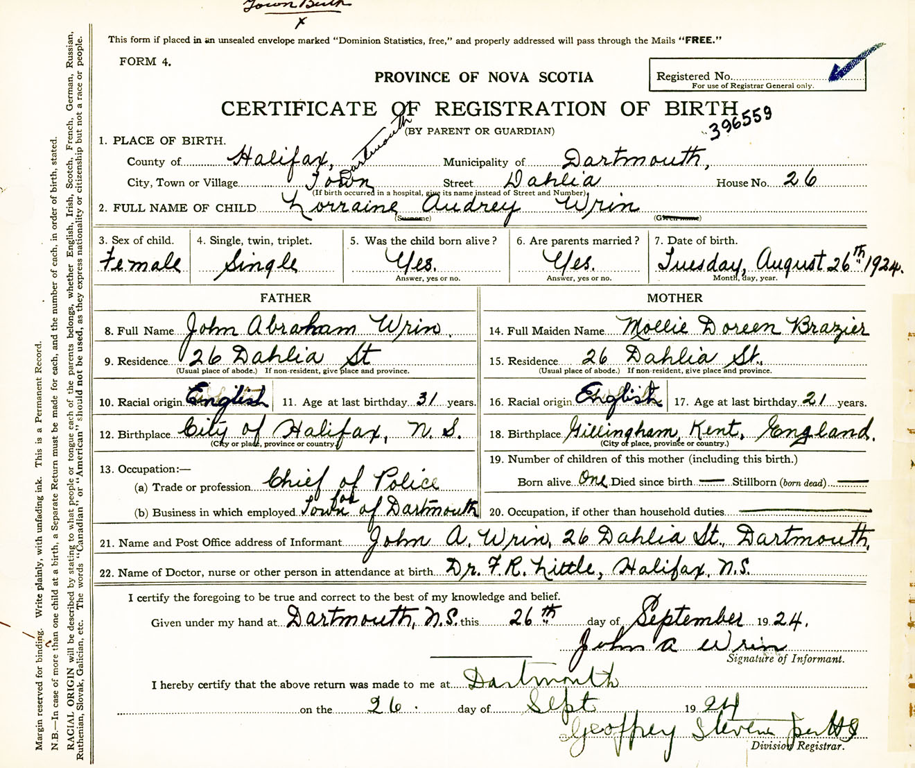 Female Birth Registration: Year: 1924 number: 39600559