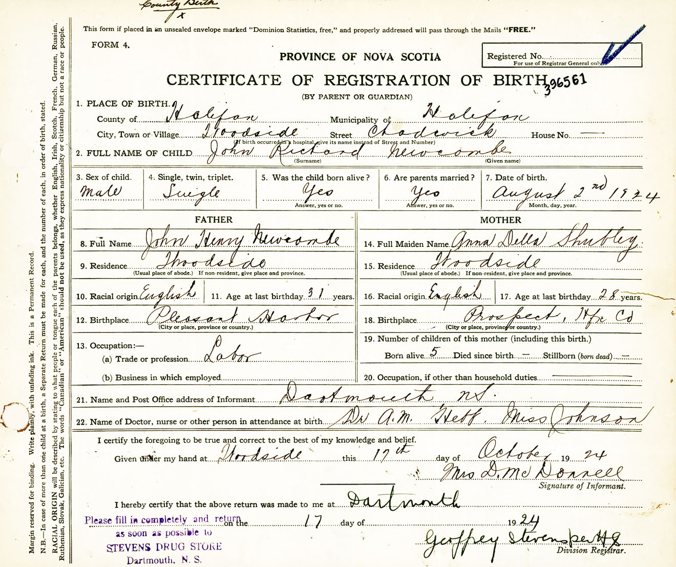 Male Birth Registration: Year: 1924 number: 39600561