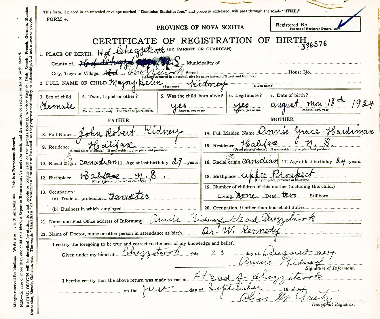 Female Birth Registration: Year: 1924 number: 39600576