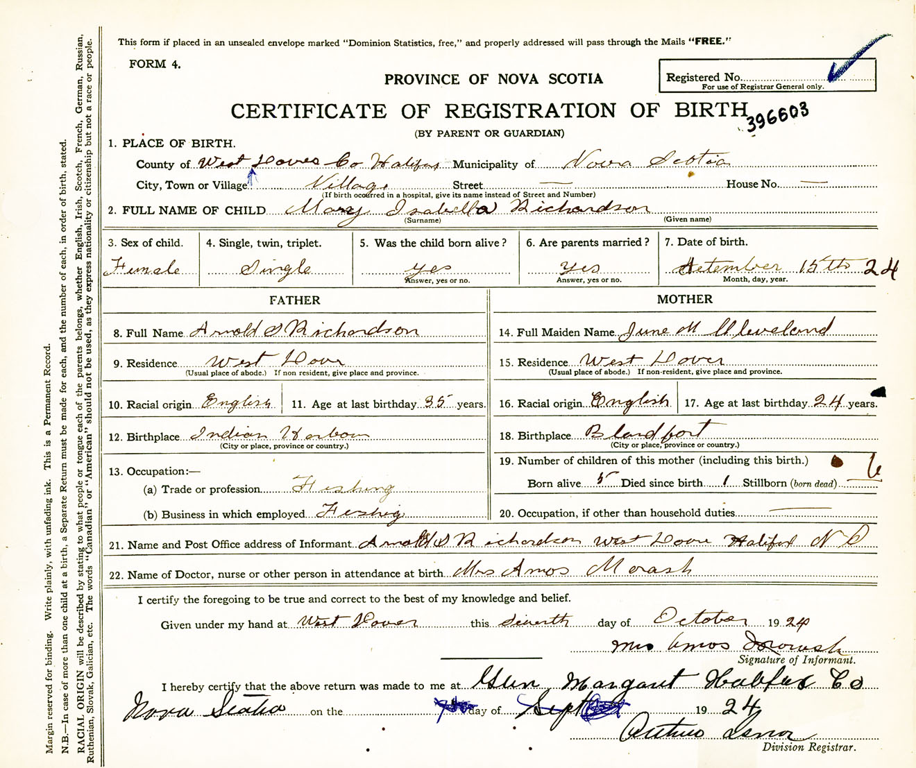 Female Birth Registration: Year: 1924 number: 39600603