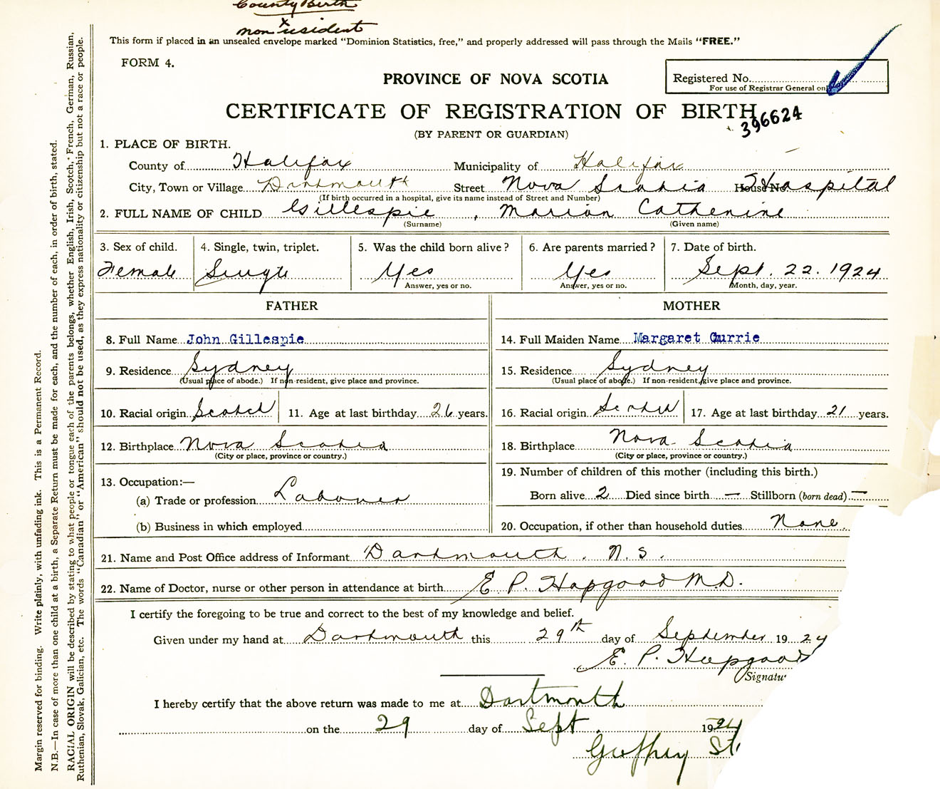 Female Birth Registration: Year: 1924 number: 39600624