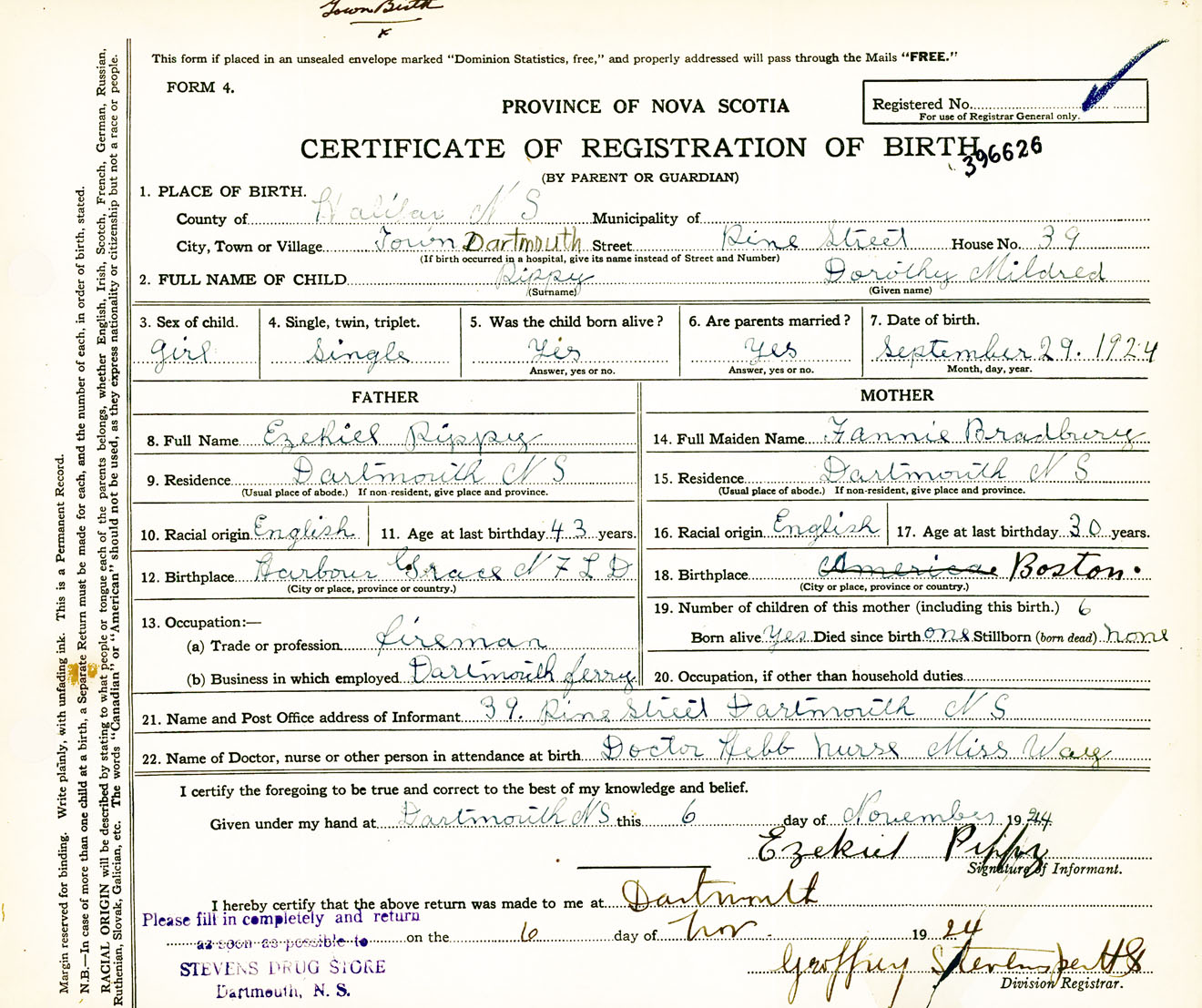 Female Birth Registration: Year: 1924 number: 39600626