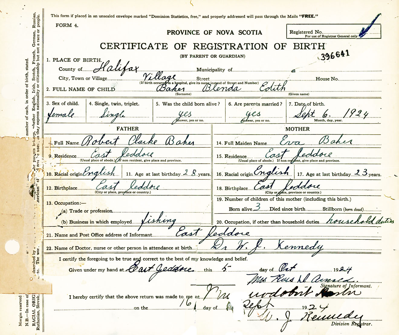 Female Birth Registration: Year: 1924 number: 39600641
