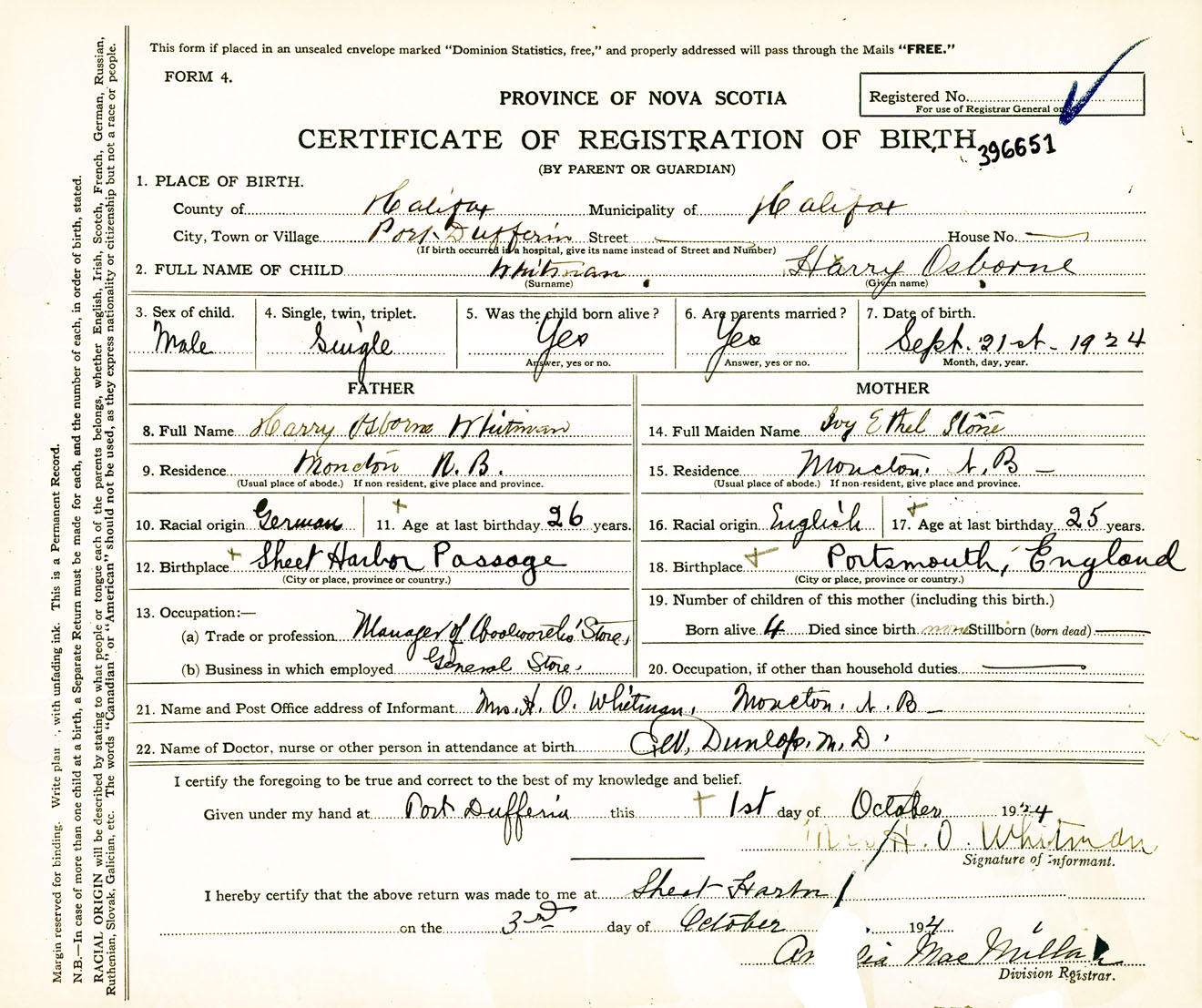 Male Birth Registration: Year: 1924 number: 39600651